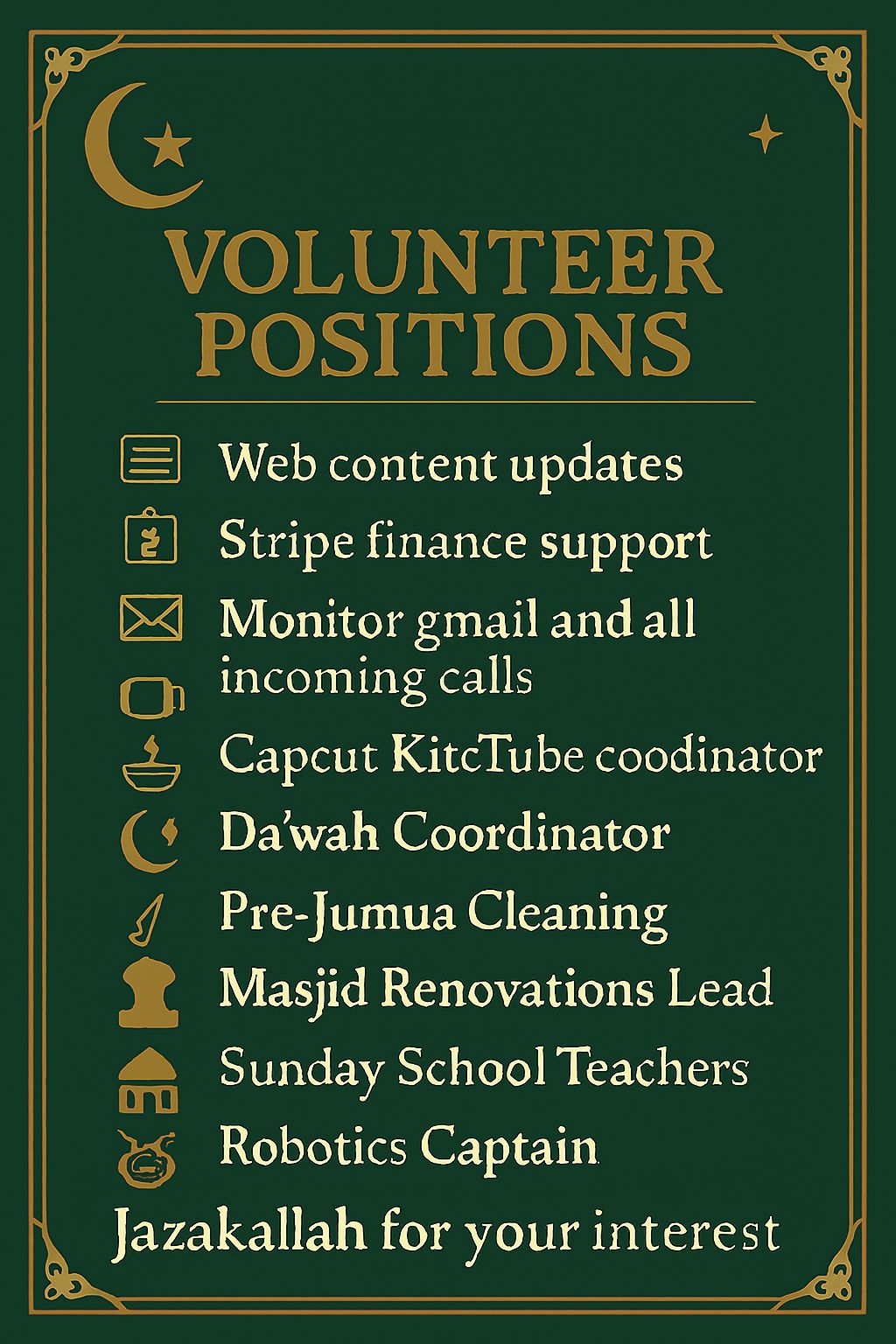 Through prayer, learning, and community outreach, we strive to cultivate a welcoming environment where individuals of all ages can deepen their connection with Allah ﷻ, live by the teachings of the Qur’an and Sunnah, and contribute positively to society.